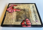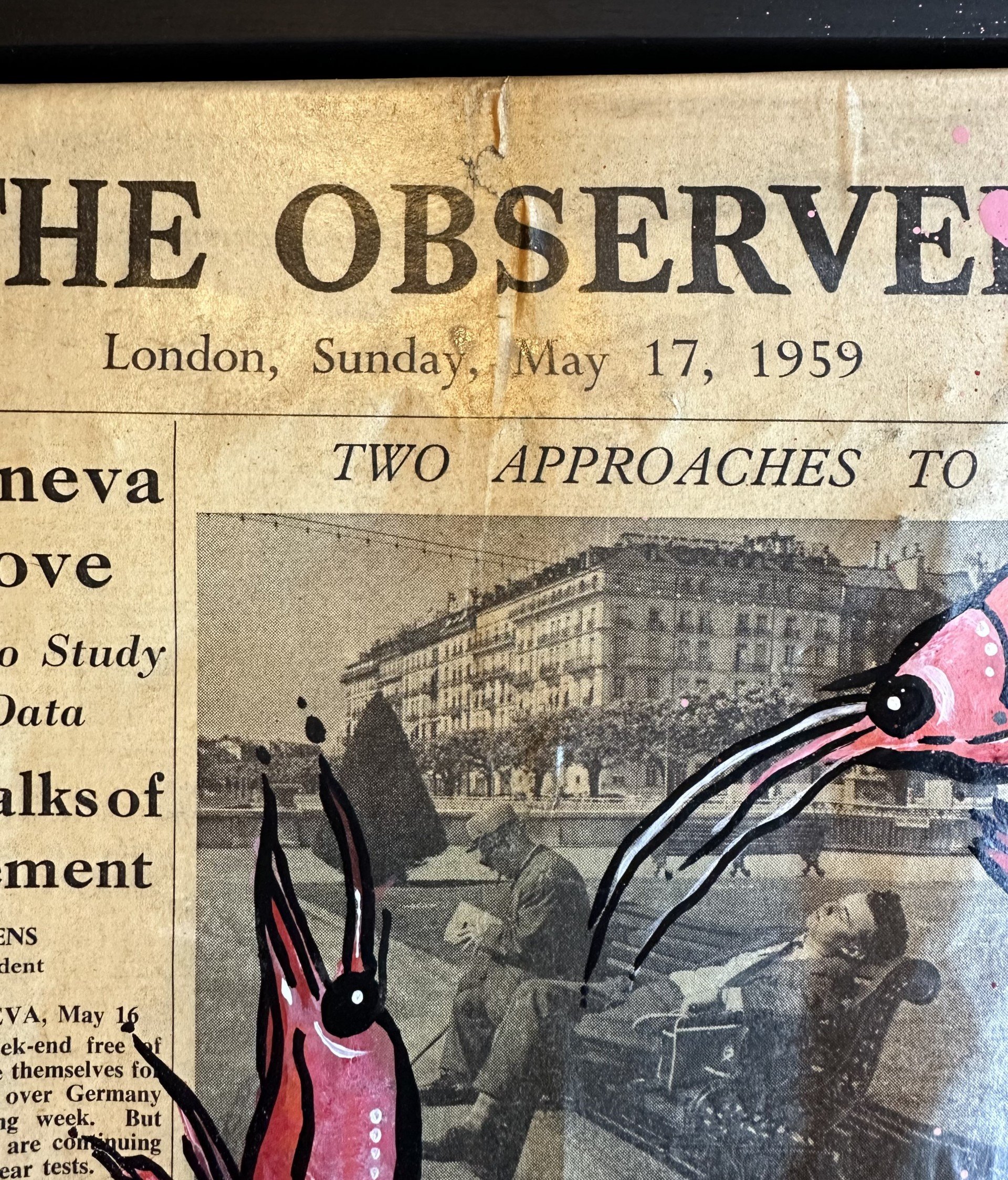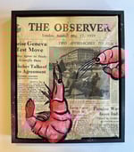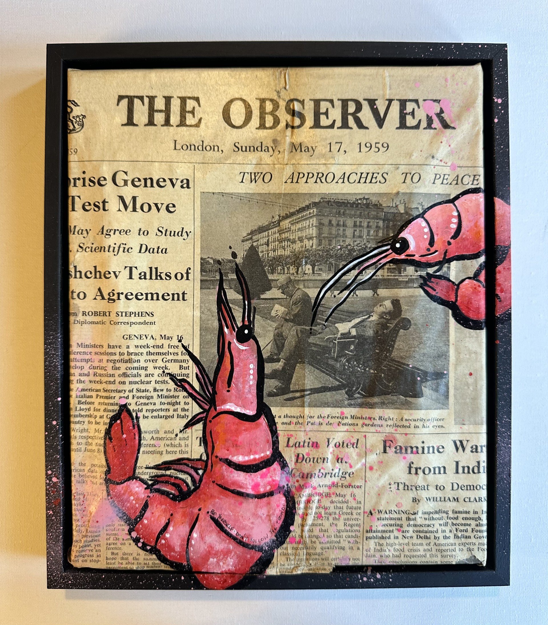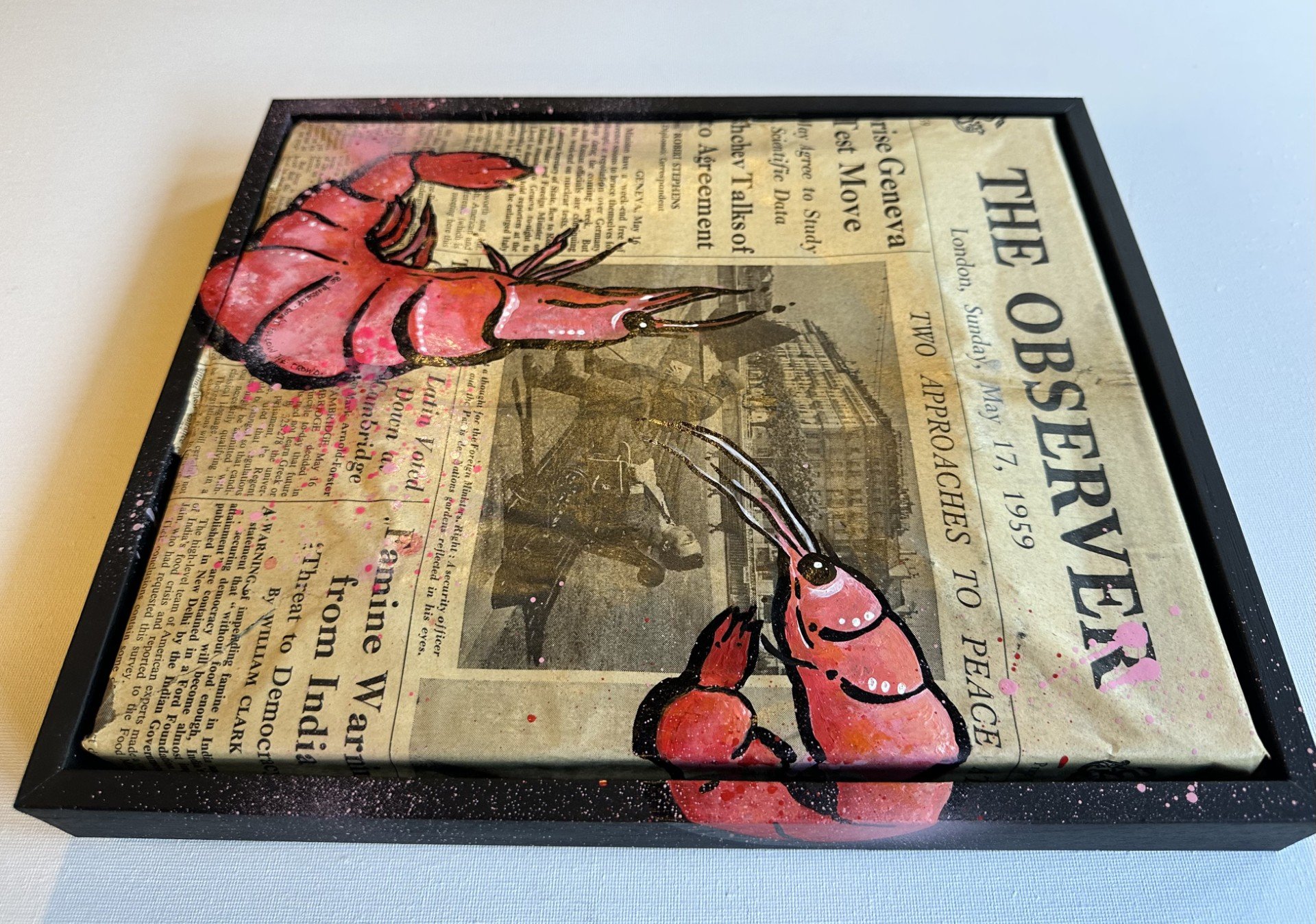 Hand painted prawns (acrylic, pigment inks & spray paint) onto vintage THE OBSERVER newspaper dated Sunday 17th May 1959. Box canvas with layers underneath the newspaper to make it more 3D. Black float frame which has been incorporated into the prawn painting.