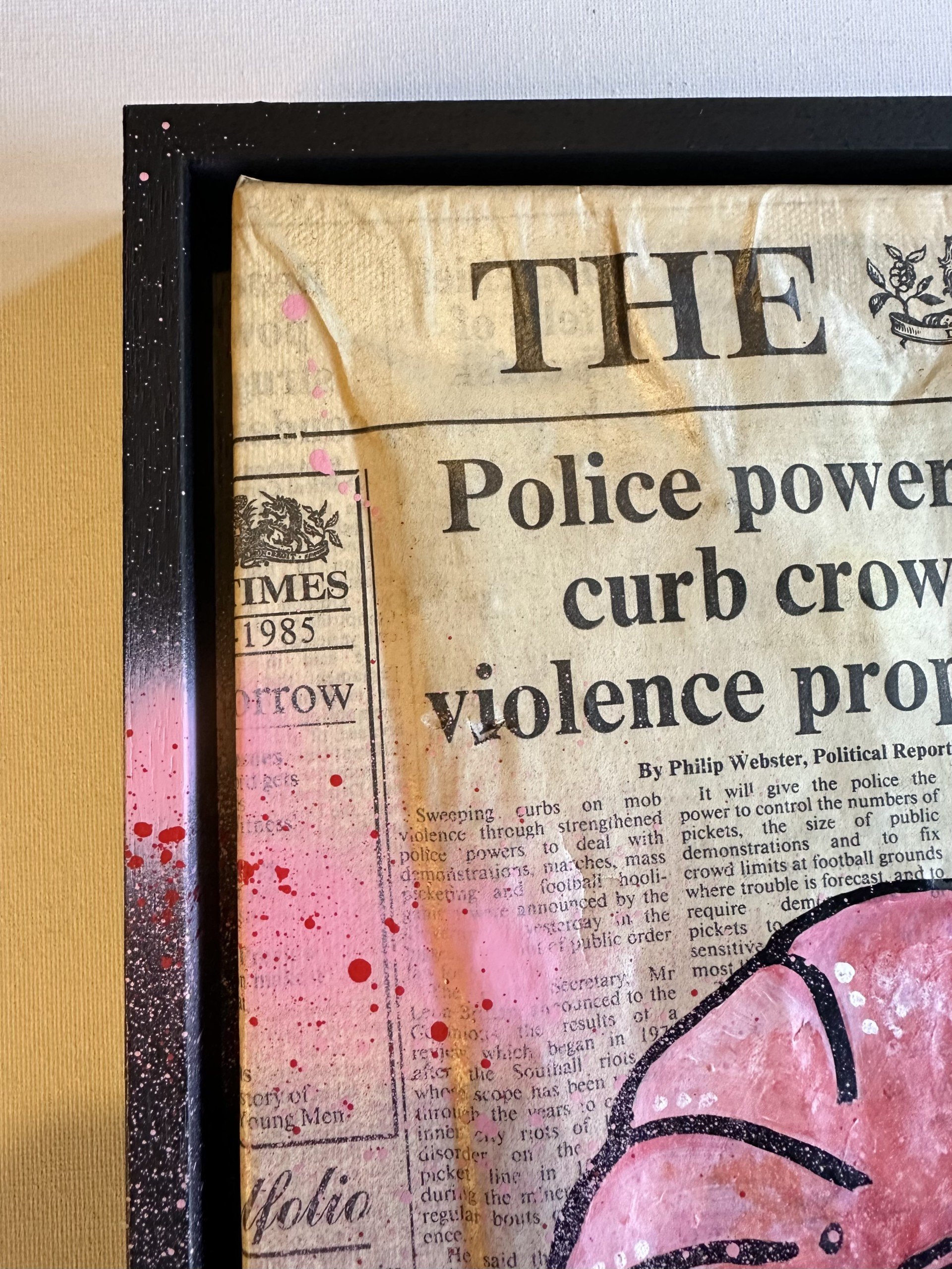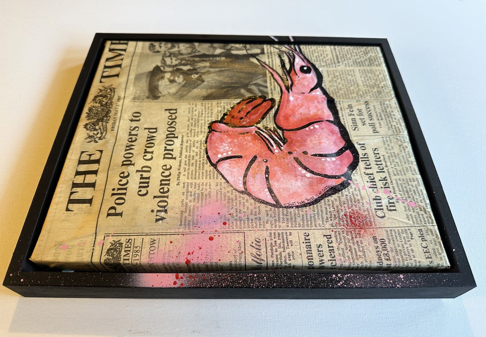 Hand painted prawn (acrylic, pigment inks & spray paint) onto vintage TIMES newspaper dated Friday 17th May 1985. Box canvas with layers underneath the newspaper to make it more 3D. Black float frame which has been incorporated into the prawn painting.